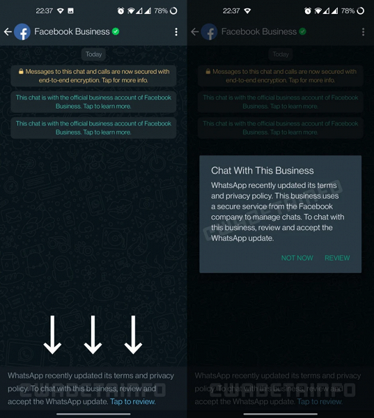 Теперь XDA-Developers сообщает, что новые условия могут быть необязательными. WABetaInfo обнаружил документ, в котором указано, как будут использоваться новые условия и что они будут необязательными для большинства пользователей WhatsApp. Facebook, похоже, теперь планирует ограничить это обязательное изменение только для пользователей WhatsApp Business.