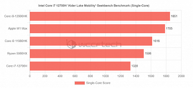 Что касается процессора, в однопоточном режиме он уступил флагману AMD и прошлому флагману Intel, а вот в многопоточном оба остались позади, хотя M1 Max всё равно остался недосягаем.