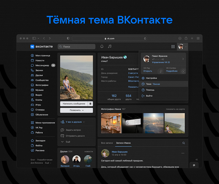 Команда «ВКонтакте» объявила о запуске тёмной темы для веб-версии на компьютерах. Как отмечает пресс-служба, это была одна из самых запрашиваемых функций со стороны пользователей.