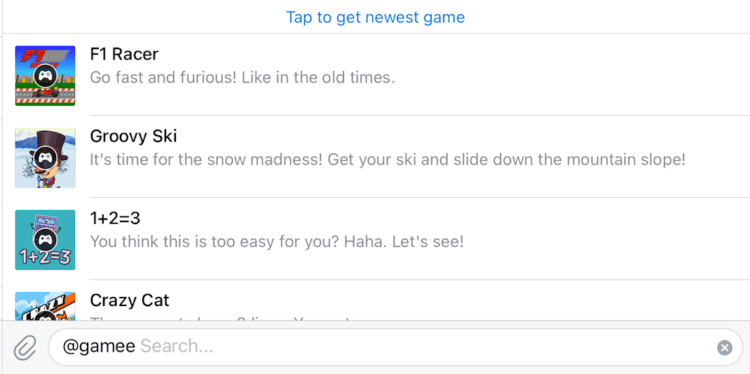 Проще всего пригласить друга в игру – это упомянуть бота @gamee в диалоге. Затем выберите игру, которая будет вам предложена, дождитесь согласия от друга и приступайте к игре. Каких-то особенных требований к игрокам не предъявляется – приглашённому даже не придётся устанавливать бота себе, что для некоторых может оказаться серьёзным преимуществом, поскольку они не любят добавлять к своему списку контактов абы что.