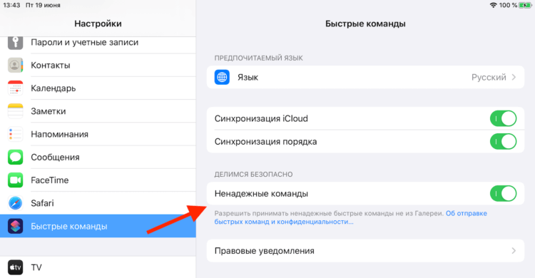 - Перейдите в «Настройки» — «Быстрые команды» и включите «Ненадёжные команды»;