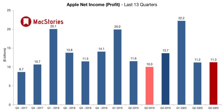 Во втором календарном (он же – третий финансовый) квартале 2020 года доход Apple был выше чем во все вторые кварталы в истории компании: 59,7 миллиарда долларов. Это на 11% больше, чем в прошлогоднем втором квартале. Чистый доход компании (после уплаты налогов, за вычетом операционных и прочих расходов) составил 11,3 миллиарда долларов.