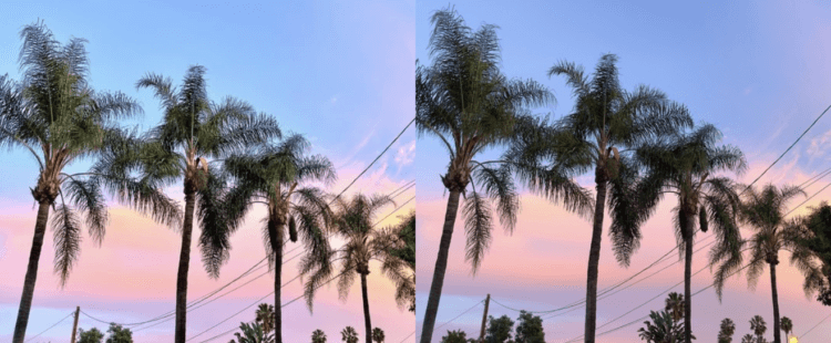 Например, на двух фотографиях выше изображена беседка в парке вечером, во время заката. На обычном фото JPEG (слева) ярко-синее небо, из-за чего создается впечатление, будто снимок сделан днем (но это не так). Свет также несколько размыт. Текстура также кажется слишком резкой, а цвет намного более желтым, чем должен быть. Версия ProRAW (справа) имеет более гладкие текстуры, более реалистичные цвета с меньшим количеством засветов и приглушенное небо.