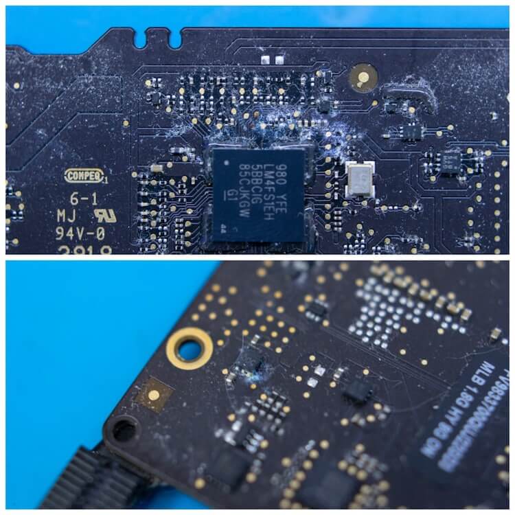 Так выглядит материнская плата MacBook на которую попала вода. Воды в этом случае попало мало, но коррозия глубокая. Фото предоставлено сервисным центром Apple Pro.