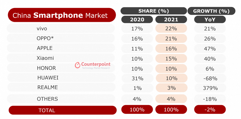 В четвертом квартале 2021 года компания Apple превзошла vivo по продажам смартфонов в Китае и стала брендом №1 на крупнейшем рынке впервые за последние шесть лет с того момента, как в её вывел в лидеры смартфон iPhone 6. По данным Counterpoint Research, доля Apple оказалась рекордно высока за все время, составив 23%.