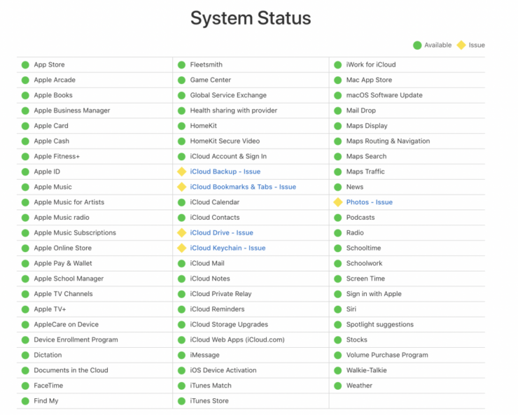 - Перейдите на страницу Состояние системы Apple, и убедиться, что в настоящее время нет никаких перебоев.