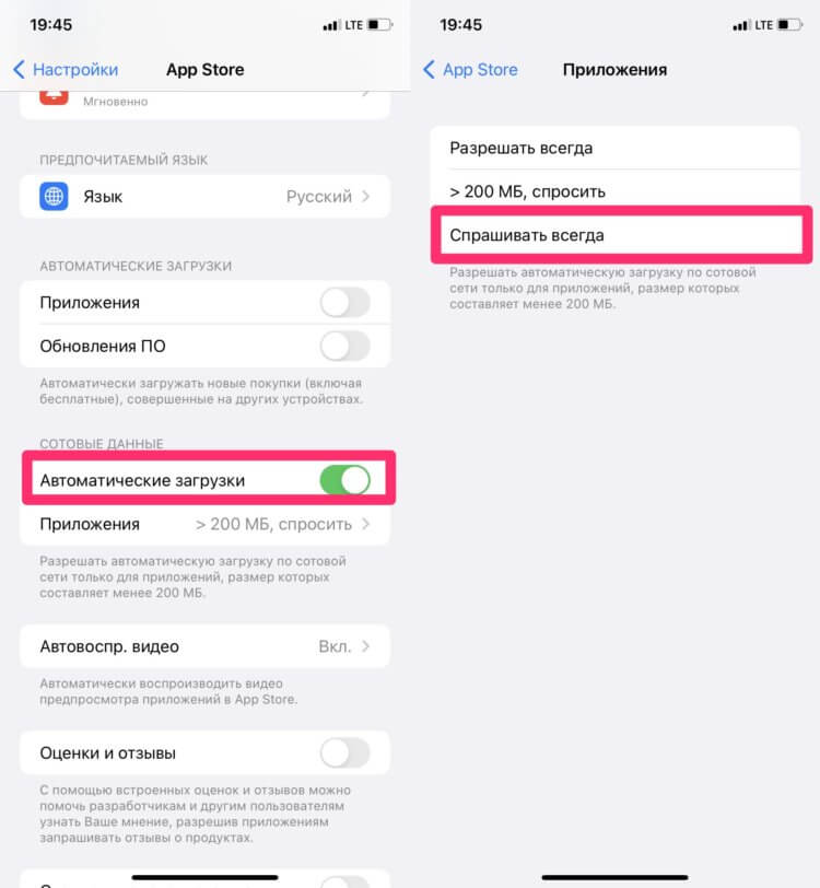 Установив тумблер напротив пункта Спрашивать всегда вы сможете обезопасить себя от случайного скачивания обновления какой-нибудь игрушки на 10 ГБ. При этом Айфон больше не будет противиться загрузке по сотовой сети. Удобно? Мне кажется, что да.