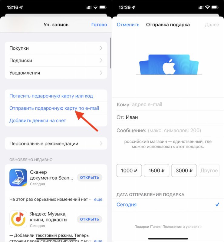 - Введите адрес электронной почты получателя и выберите сумму подарка;