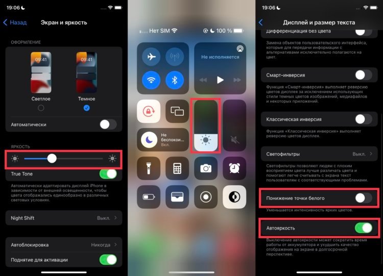 В случае если яркость установлена на минимальном уровне, просто потяните ползунок вверх в пункте управления или вправо в настройках. Экран должен стать несравнимо ярче и сочнее. Такой уровень могла установить автояркость. Для ее отключения необходимо: