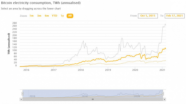 Составители Кембриджского индекса энергопотребления биткойна (Cambridge Bitcoin Electricity Consumption Index) представили его новую версию, которая, как зеркало, отражает возросший интерес пользователей к добыче криптовалюты. Как утверждается, на эти цели сейчас уходит около 116 ТВт·ч электроэнергии в год.