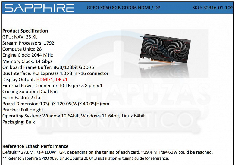 GPRO X060 базируется на GPU Navi 23 XL с 1792 потоковыми процессорами. Максимальная частота GPU достигает 2044 МГц, частота памяти GDDR6 объемом 8 ГБ – 14 ГГц. Ширина шины памяти – 128 бит. Интересно, что эта модель, в отличие от старшей, оснащена видеовыходами DisplayPort и HDMI, так что после окончательного перехода Ethereum на консенсус Proof-of-Stake, майнеры смогут перепродать GPRO X060 геймерам. К тому же в данном случае поддерживается ОС Windows.